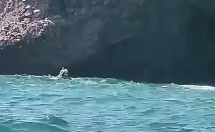 Members of the Aquatic Police Corps were alerted to the presence of a recent model vehicle that was hit by the waves and had its front and rear fenders torn off, so with the help of a crane they managed to get it out.