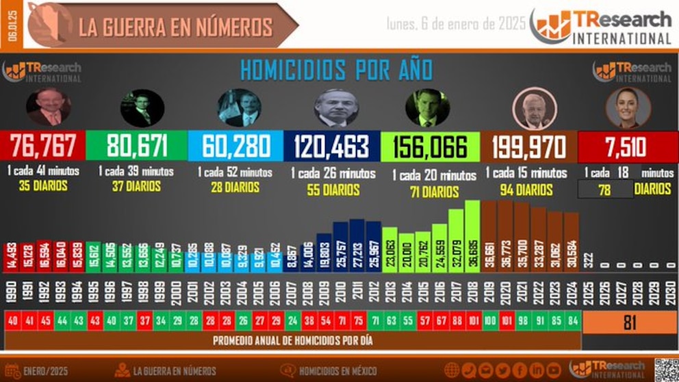 Data from the Executive Secretariat of the National Public Security System (SESNSP) indicate that between October and November 2024, 4,242 investigation files were opened for the crime of intentional homicide throughout the country; however, the figure rises to 7,510 victims in the count of the organization TResearch as of January 5, 2025.