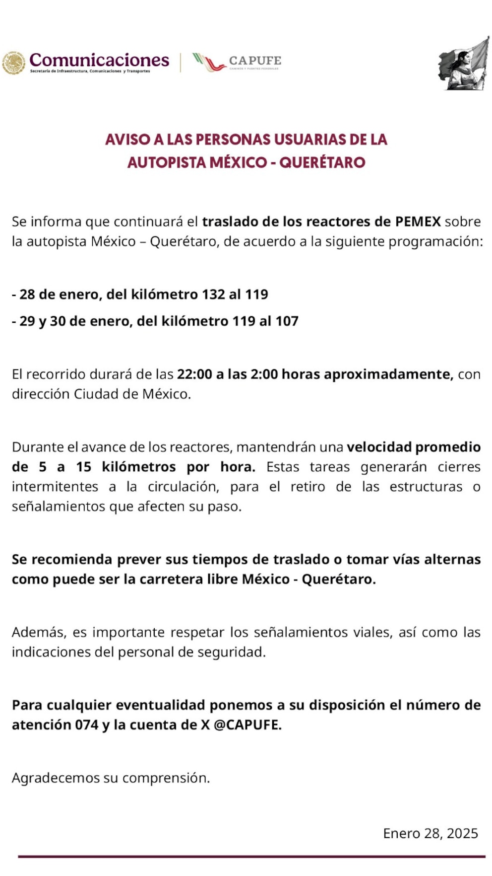 Therefore, he recommended planning their travel times or taking alternate routes such as the free Mexico-Querétaro highway, as well as respecting road signs and instructions from security personnel.