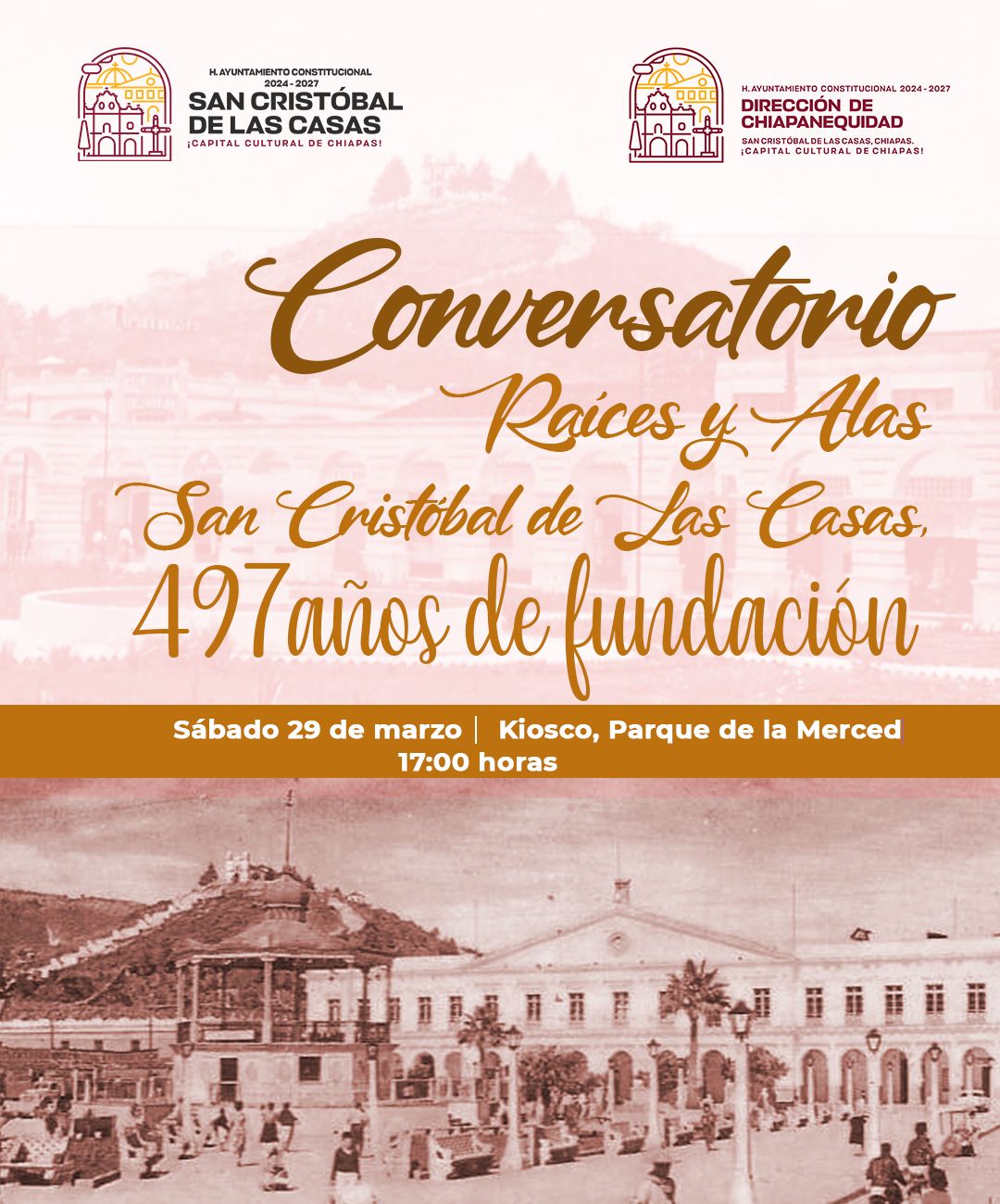 The Constitutional City Council of San Cristóbal de Las Casas 2024-2027 and the Chiapanecultura Directorate invite the public to the “Roots and Wings” Conversation, a space to reflect and share the history, identity, and legacy of this emblematic city 🌄🏛️.