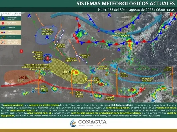Today, the Mexican monsoon, a mid-level trough over the northwest of the country, and atmospheric instability will bring showers and heavy to very heavy rains to Baja California, Baja California Sur, Sonora, Chihuahua, Durango, Sinaloa, and Nayarit. Furthermore, a low-pressure trough over the interior of Mexico, combined with an upper-level trough and the movement of Tropical Wave No. 27 over the west of the country, will cause showers and heavy to very heavy rains in that region, as well as in northeastern, central, southern, and eastern Mexico, with occasional heavy rains in Guerrero.