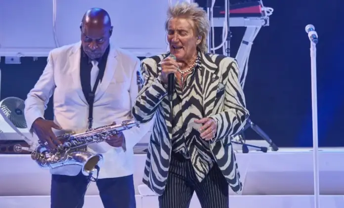 At 9:00 p.m., like a true English gentleman, Sir Rod Stewart, 80, took the stage wearing a zebra-print suit, accompanied by his musicians and backing vocalists, who would play an important role during the evening. From the very beginning, he demonstrated the energy of another era, the kind of energy that rock legends are made of, completely inexhaustible.
