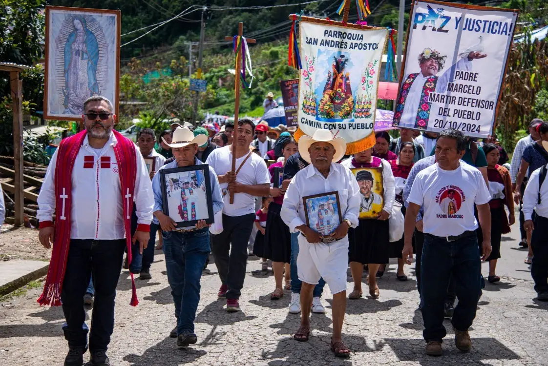 Amid chants such as: “What do we want? Justice for Father Marcelo!” and “Marcelo lives, the struggle continues!” the protesters—largely members of the Tzotzil, Tzeltal, Tojolabal, and Chol ethnic groups—traveled more than six kilometers to the central plaza of San Andrés Larráinzar, a town near San Cristóbal de las Casas and the parish priest’s hometown.