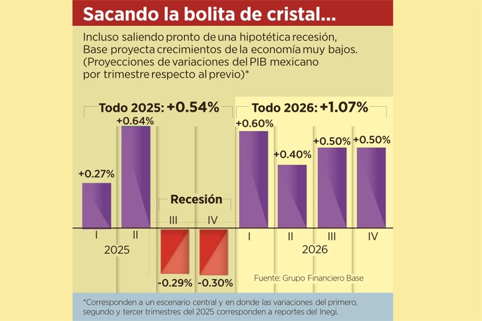 However, Gabriela Siller, Director of Economic Analysis at Banco Base, stated during the presentation of the analysis that the country’s economy is likely heading toward stagnation that could last for several years. “It is estimated that Mexico’s GDP could grow by 0.54% this year and will show higher growth in 2026, but only by 1.07% (in central scenarios).