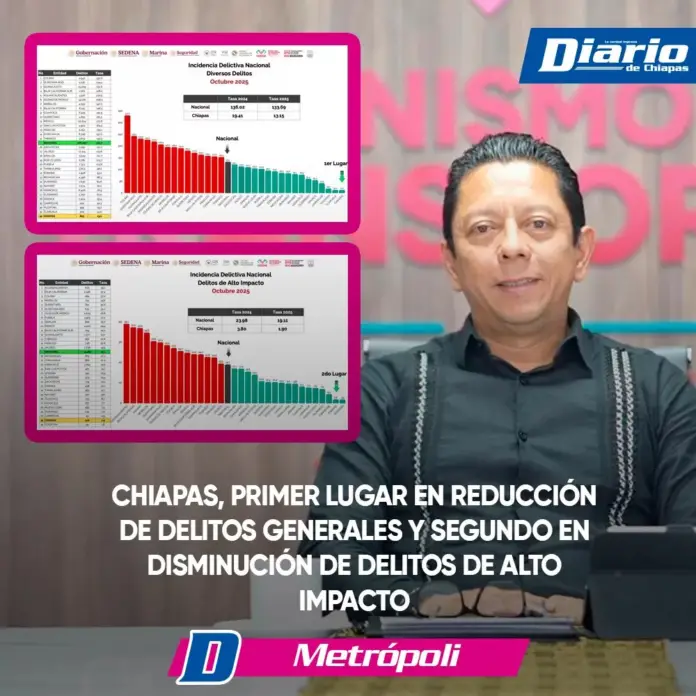 The Attorney General of the State of Chiapas, Jorge Luis Llaven Abarca, highlighted that, according to the Executive Secretariat of the National Public Security System, from January to October 2025, Chiapas ranked second nationally in the reduction of overall crime rates, with a score of 160.5, only surpassed by Tlaxcala with 150.3; a figure well below the national average of 1,280 crimes per 100,000 inhabitants.