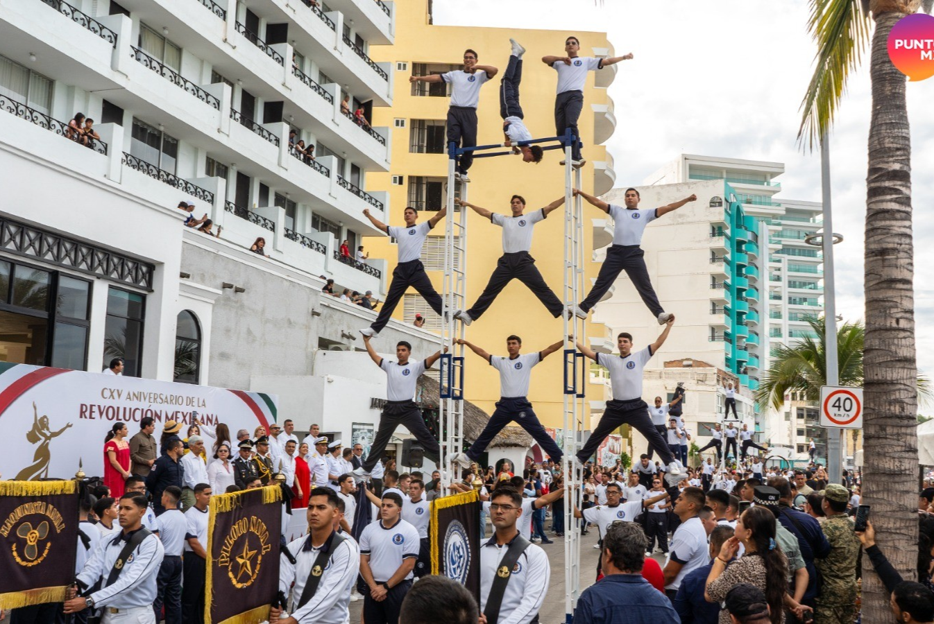Participating institutions included COBAES, CETMAR, CBTIS, CETIS, UAdeO, UPES, ITMAZ, UPSIN, and UAS, as well as private schools such as UAD, Sinaloense, and ICO, each showcasing choreographies, rhythmic routines, and presentations inspired by figures from the Revolution.