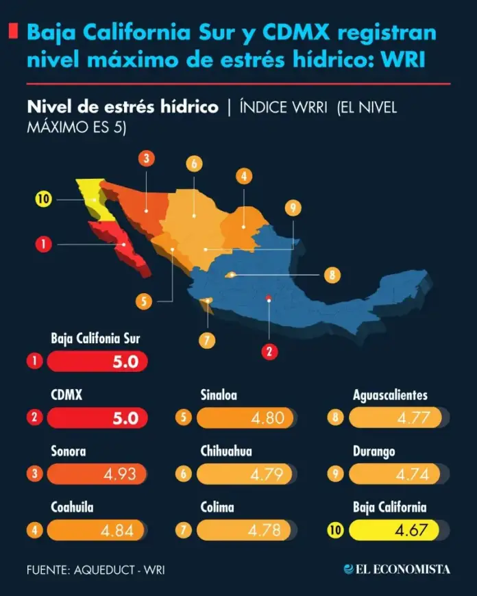 Baja California Sur and Mexico City are the states with the highest level of water stress in the country, with a score of 5 (the maximum), according to the Aqueduct Waterpolists Risk Atlas ranking.