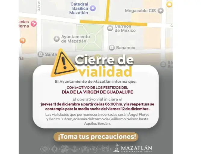 In observance of the traditional celebration of the Day of Our Lady of Guadalupe, the Municipal Public Security Secretariat, through its Traffic Sub-Directorate, announces that several streets surrounding the Cathedral Basilica of the Immaculate Conception will be closed to traffic.
