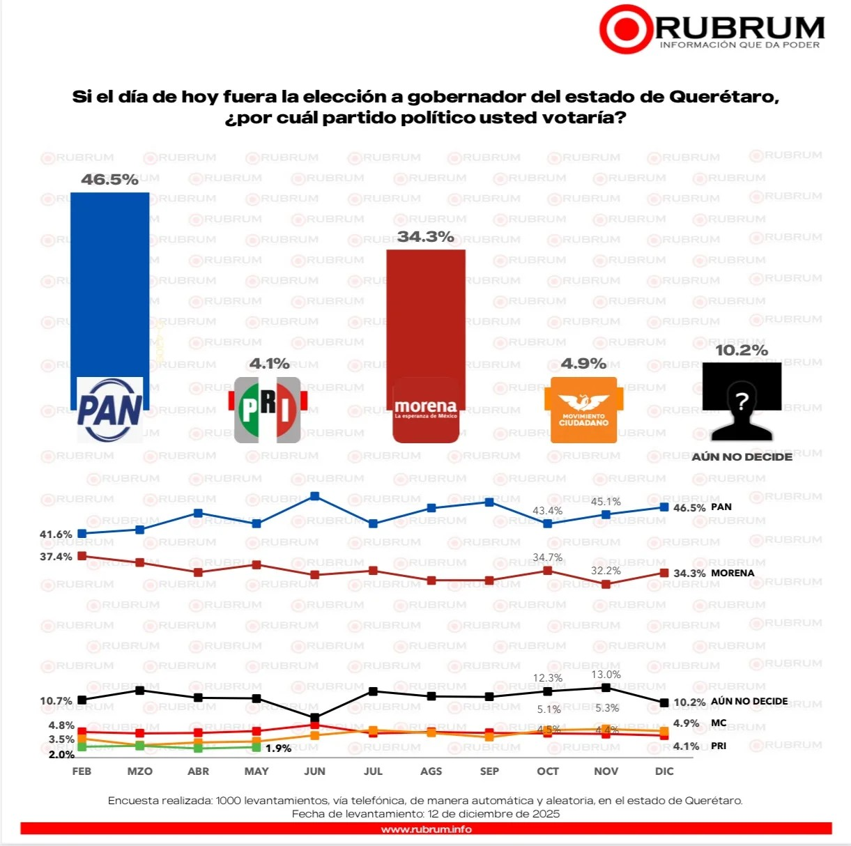 The latest survey by RUBRUM, “information that empowers,” outlines the landscape for the 2027 Querétaro gubernatorial election. In terms of party preference, the PAN (National Action Party) remains in the lead with 46.5%, followed by MORENA (National Regeneration Movement) with 34.3%. Further behind are Movimiento Ciudadano (Citizens’ Movement) with 4.9%, the PRI (Institutional Revolutionary Party) with 4.2%, while 10.2% of respondents are still undecided.