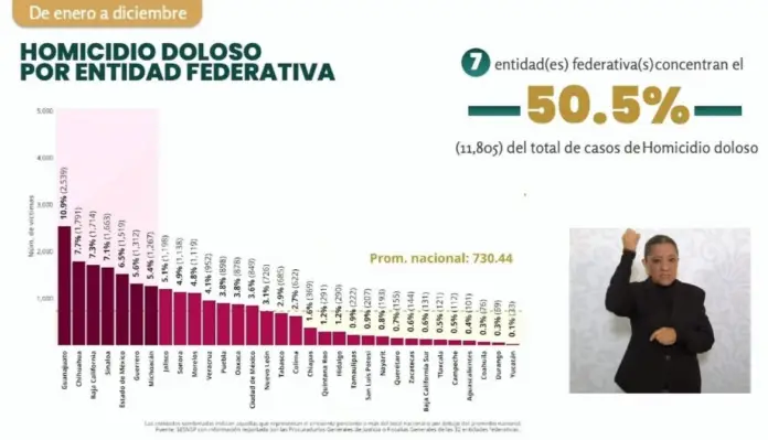 The Executive Secretary of the National Public Security System, Marcela Figueroa, announced that last year, seven states accounted for the highest number of intentional homicides. Guanajuato with 2,539, followed by Chihuahua with 1,791, Baja California with 1,714, Sinaloa with 1,663, the State of Mexico with 1,519, Guerrero in sixth place with 1,312, and Michoacán with 1,267. (Omnia.com.mx)