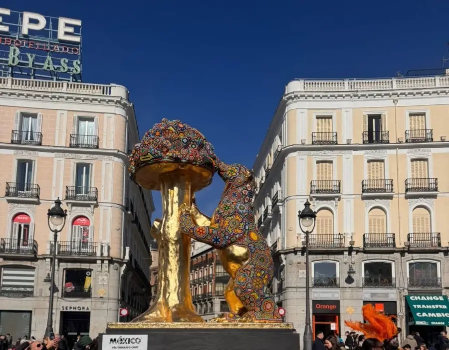 Madrid was adorned with color thanks to a work that unites two culturally significant symbols. In the Puerta del Sol, the heart of the Spanish capital, a creation was unveiled that unites both destinations. The iconic Bear and the Strawberry Tree sculpture now has a ‘twin’: a replica entirely transformed with Wixárika art that has captivated locals and tourists alike.