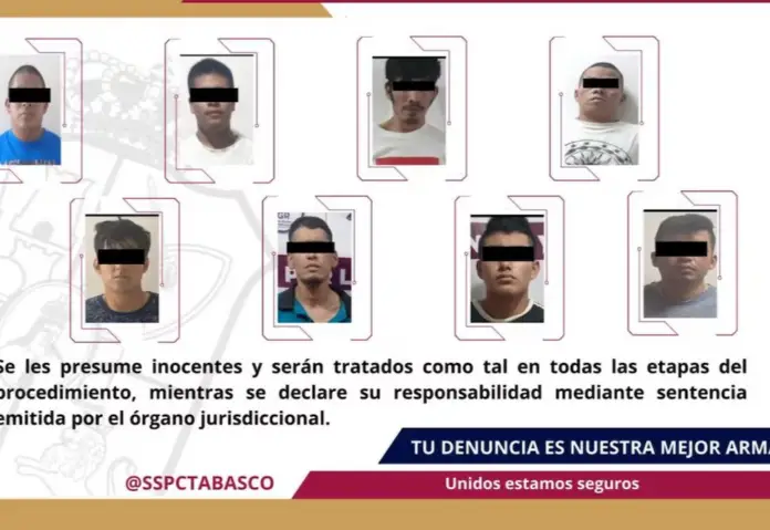 It was reported that through the Tabscoob Special Group, in coordination with the FIRT Olmeca, eight men were arrested as alleged perpetrators of crimes against the General Health Law and possession of a firearm restricted to the Mexican Army, in the municipality of Macuspana.
