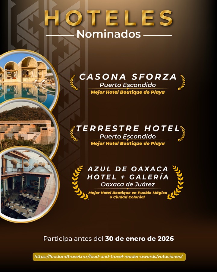 Also participating are Azul de Oaxaca Hotel + Galería, as Best Boutique Hotel in a Magical Town or Colonial City; Casona Sforza and Terrestre Hotel, both nominated as Best Beach Boutique Hotel.