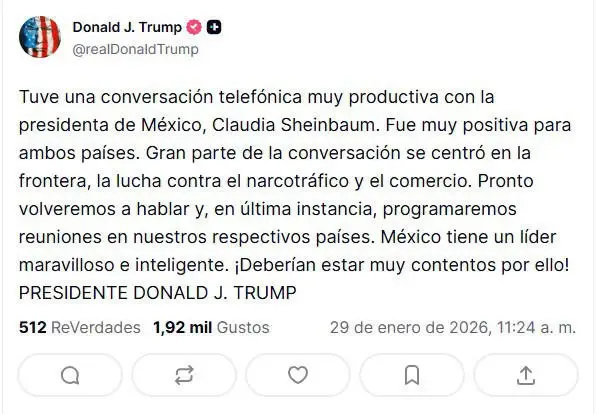 Trump asserted that “Mexico has a wonderful and very smart leader. They should be very happy about that!” the president said in a message on his Truth Social network, adding that they would speak again soon.