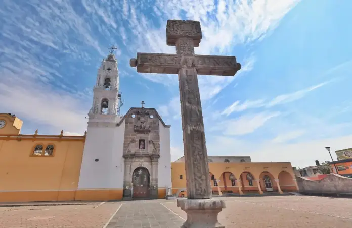 San Luis Teolocholco, whose cross incorporates the image of Tláloc, demonstrates a cultural fusion. Years ago, it was removed from its original location. Today, it is located on the south side of the atrium of the San Luis Obispo parish church.