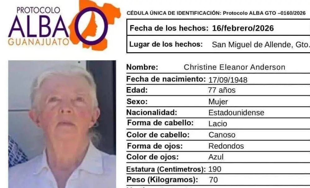 According to the information released during the search, the 77-year-old woman had lived for several years in San Miguel de Allende, where she resided alone in a house in Villa de Los Frailes. She reportedly left her home on February 16 without anyone knowing where she was going.