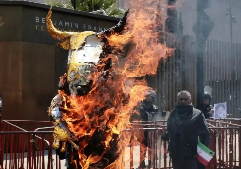At least 60 activists and members of the Iranian community set fire to an effigy of the Semitic god Baal near the U.S. Embassy in Mexico City on Saturday.