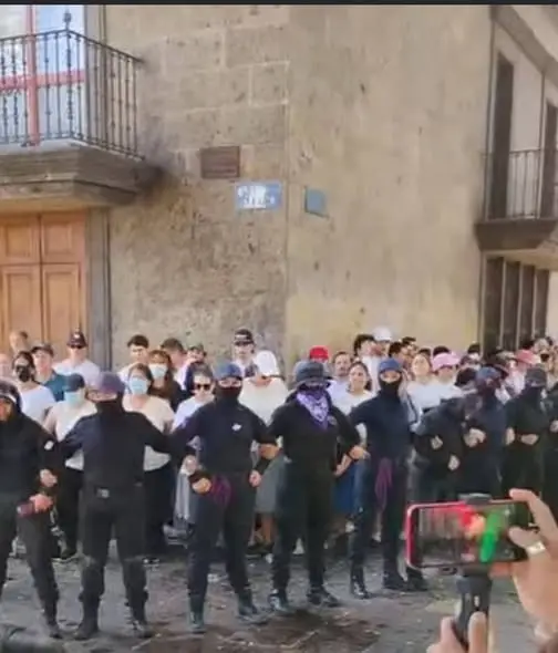 A group of protesters threw water and shouted slogans in front of the Templo del Carmen, which is guarded by civilians in white and police officers. While the women protested, the security guards responded with apparent mockery, creating tense moments during a pause in the march.