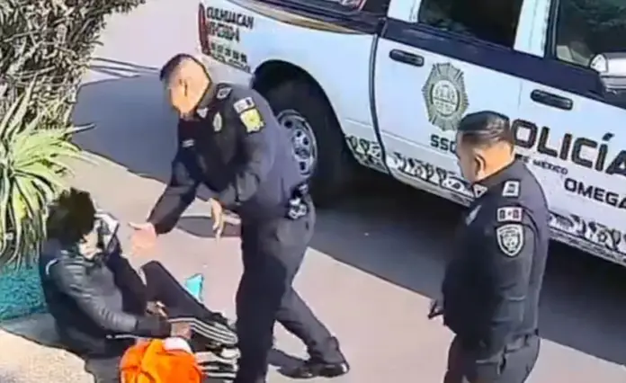 Subsequently, a vehicle from the Secretariat of Citizen Security (SSC) approaches, while the aggressor officer continues searching the young man and another officer simply watches.